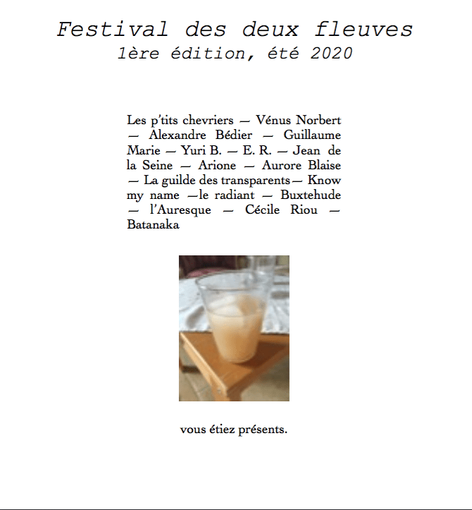 Préludes, de Pierre StordeurFDDF, édition « assemblage » 2022Campagne du PPP, à DuesmeVieux jeu, de Camille Tolila-MercierBanquet fluvial #1Poèmes de marché de la poésieEquêtes au CNSMDPFDDF édition « prototype » 2021Studio mandolineConférence-performance à ArlesFDDF édition « transparente » été 2020L’atelier des transparent-e-sL’exposition shanghaïaiseWorkshop « hautes études »Enquêtes à l’ENDAVies d’objets – l’atelier de Tian DexiEthnographie aux beaux-arts, enquête et épistémologie fabulatoirePoèmes du 7e, par Guillaume MariePeter Dayton, compositeurConversation, avec Manuel HoussaisCouleur temple, par Yves BergeretRencontre avec l’association ViaLa SoifHai Zi, quatre poèmesSept points d’exclamation, par Giampaolo de PietroMessiaen/Blanc : une mise en Regards…