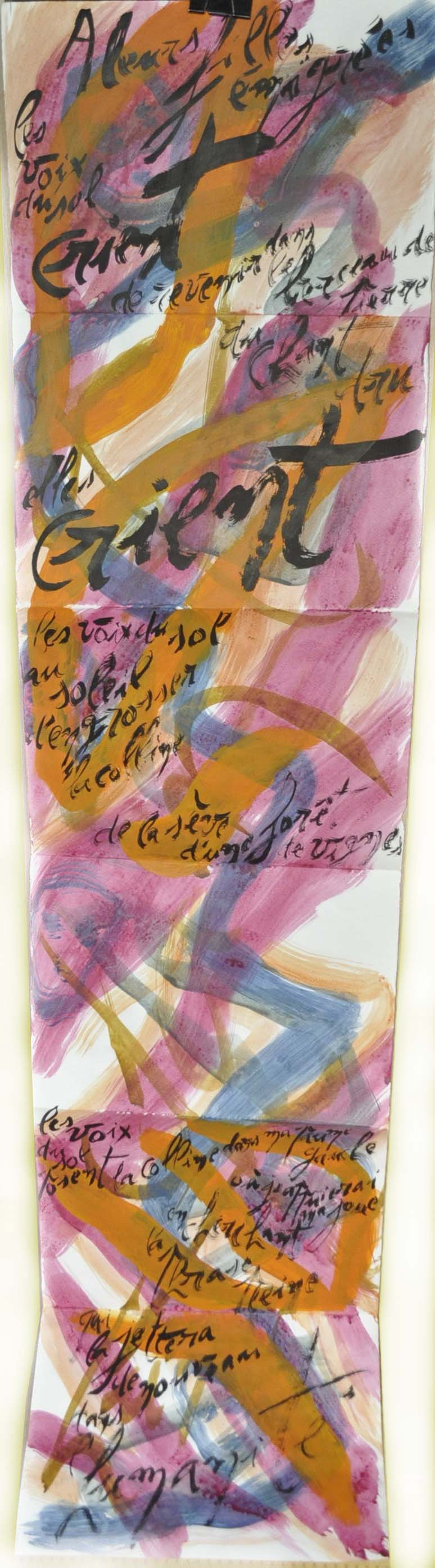 Le texte calligraphié, d’abord, s’organise à la surface du papier selon des regroupements plus ou moins serrés, correspondants globalement aux strophes du poème. Cette graphie évidemment ne peut coder dans l’immédiat les hauteurs, donc la mélodie, qu’on pourrait improviser sur un instrument, monodique par exemple ; en revanche elle pose de manière visuelle des densités, des rythmes, une certaine vitesse de formulation dans le tracé, net ou esquissé, données se rapprochant fortement des éléments d’une partition classique dans leurs aspects visuels. Sorte de groupements de notes, non code, mais déjà jeu, sous l’expression et la « diction » du poignet qui les trace et les exprime, les lettres posées à l’encre renvoient à diverses interprétations musicales possibles, et donnent au premier coup d’œil la forme générale d’un développement où alternent et se combinent zones denses et silences. Des variations de taille et d’épaisseur entre les mots du poème peuvent aussi traduire une dimension d’intensité aux implications sonores évidentes : un mot s’imposant visuellement  plus que les autres pourra susciter une poussée sonore plus forte, tandis que certains autres presque imperceptibles, tracés amplement en lavis très léger à l’arrière même de la couleur, ouvrent un registre de lecture plus secret.