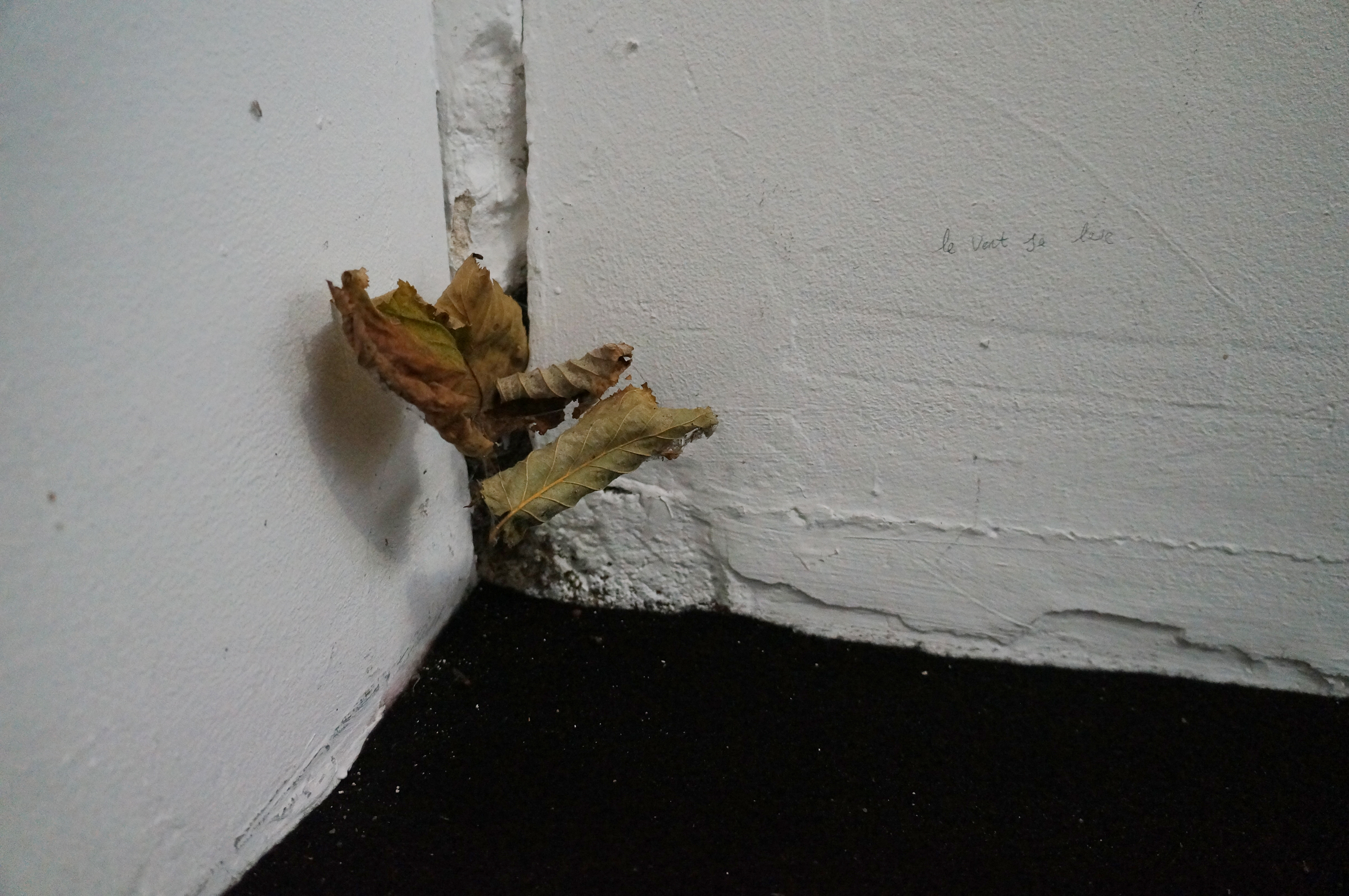 Le vent se lève: quand j’ai ouvert la porte le vent a fait entrer des feuilles et les a amenées ici dans le coin du mur, où il y a aussi un nid d’araignées. J’ai touché un tout petit peu pour organiser et j’ai mis un titre : c’est une œuvre (rires). Il y a ça aussi :