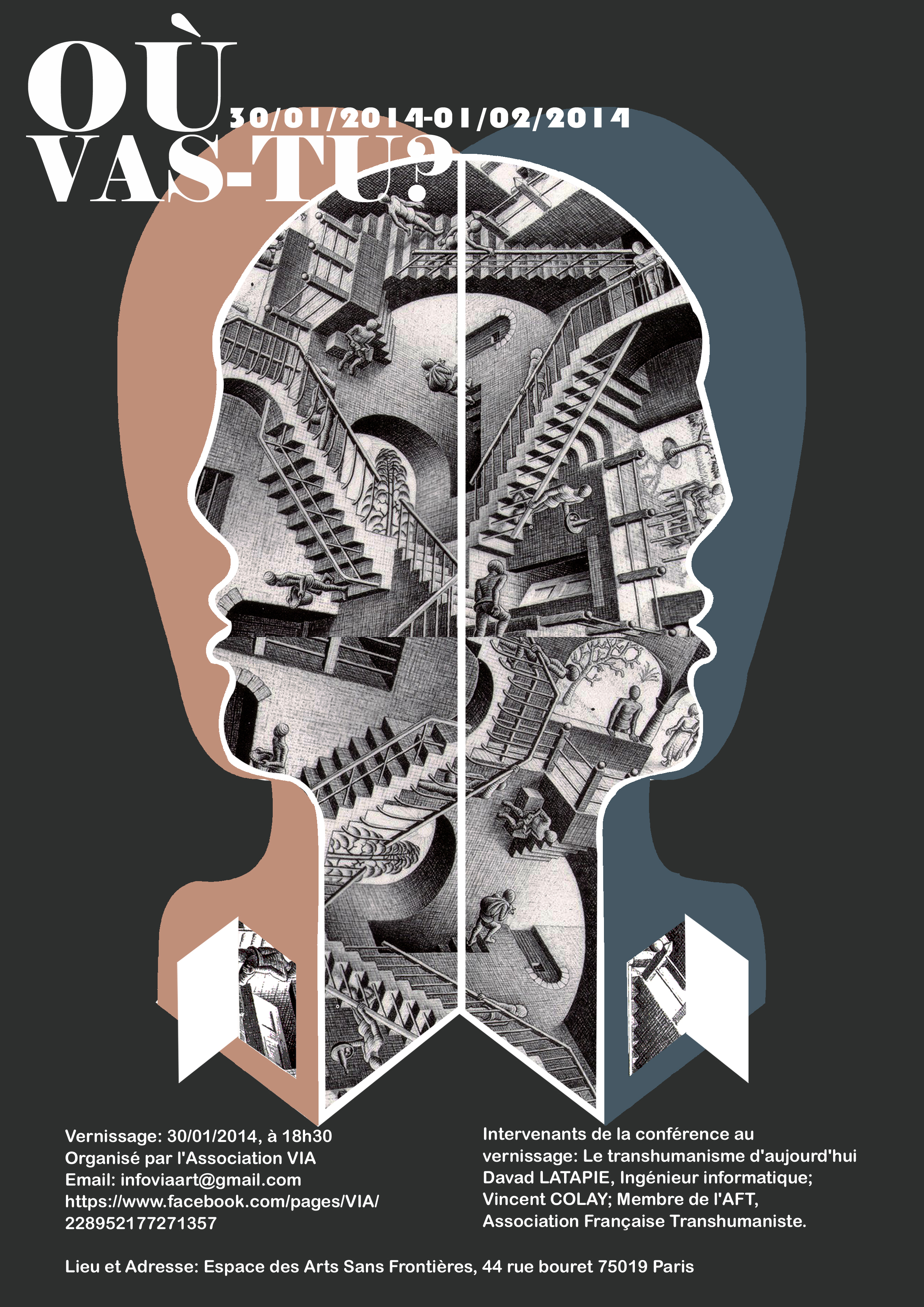 « Où vas-tu ? », deuxième exposition du groupe de création contemporaine VIA, se tiendra jeudi 30 janvier 2014 à l’Espace des Arts sans Frontières (vernissage dès 18h30), à Paris.