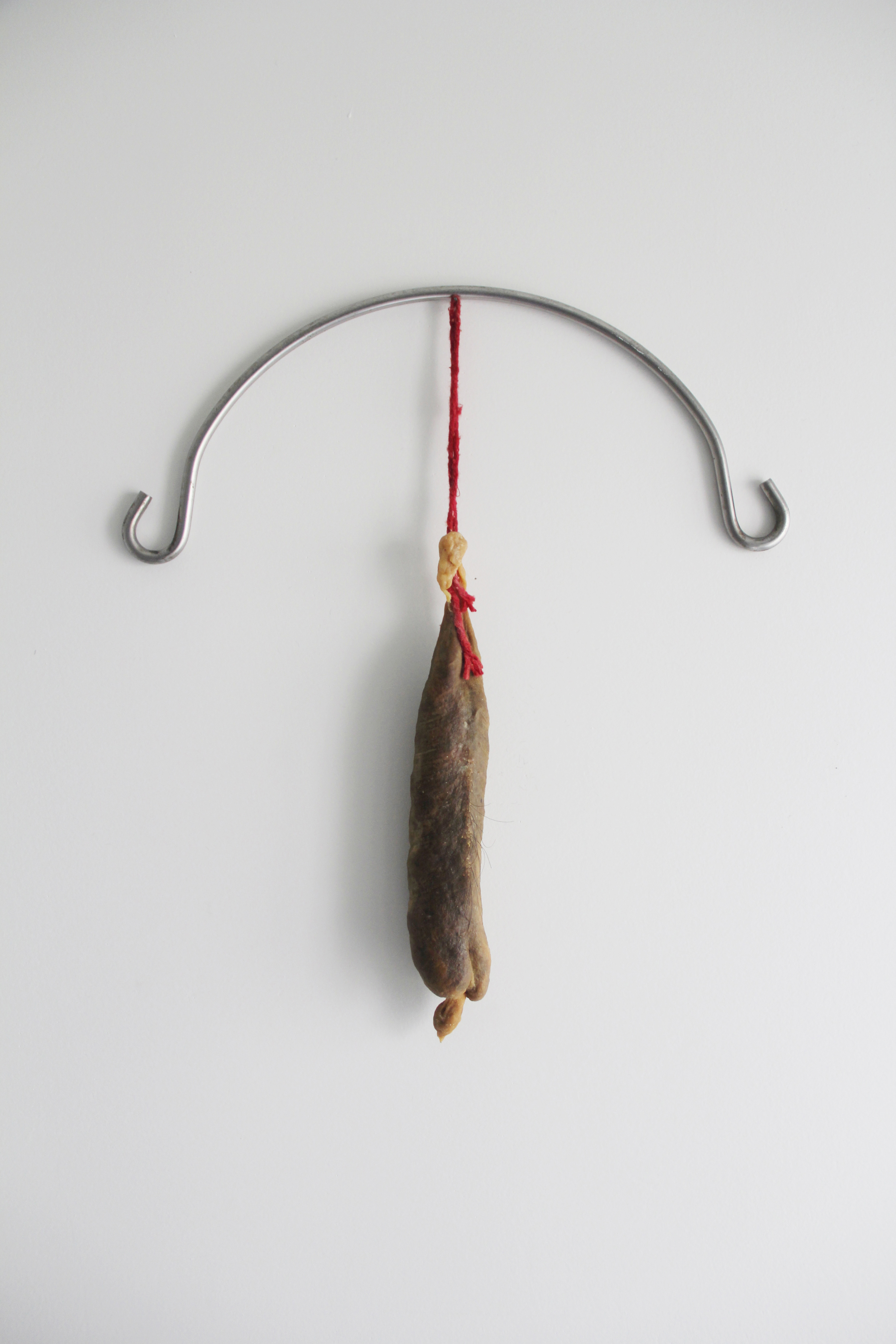 C’est un saucisson que je ne vais jamais manger : il est là depuis cinq ans. Cette pièce a suscité beaucoup d’idées auprès des gens. Une fille m’a dit c’est un pénis pas excité. Une autre personne m’a dit que c’est comme un arc. Au dessus en fait, c’est une poignée de sceau que j’ai trouvée à Bordeaux dans les vignes. Les objets m’intéressent, ils me font du bien. Évidemment, ils parlent. C’est l’objet qui me donne des idées. C’est pour ça que je ne cherche pas… Maintenant je vous montre mon atelier :
