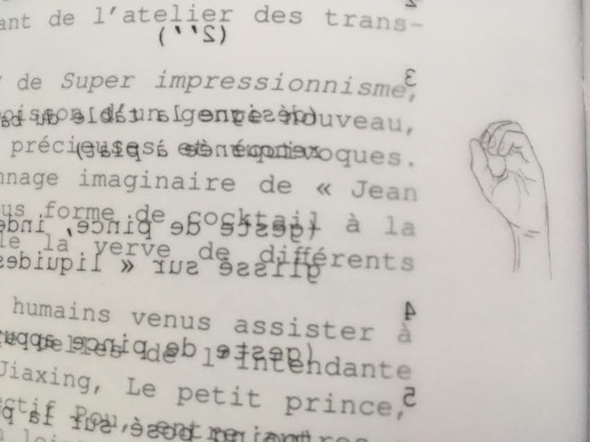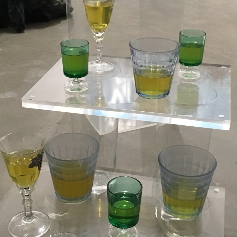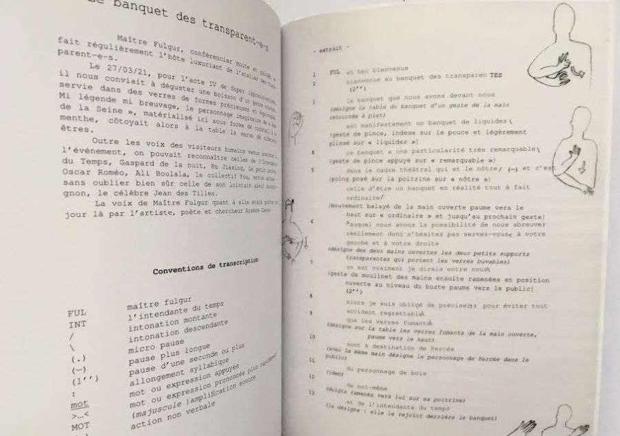 - Sur la table en verre, le « banquet des transparents » proprement dit, qui disposait les éléments issus du « musée des transparents », un musée portatif constitué de différents documents mis en exposition, réunissant en particulier des images et des noms de personnages sur divers supports : un couple galant sur une estampe ancienne (18e siècle) ; Gaspard de la nuit dans le livre d’Aloysius Bertrand ; une photographie de mode du skateur piss drunk Ali Boulala imprimée sur feuille de papier A4 ; un cours d’eau de l’Anhui en Chine photographié par Hu Jiaxing ; le Petit Prince traduit en tibétain. Ce musée incluait aussi momentanément des œuvres éphémères, notamment un doigt en argile initialement porté par le personnage de l’ « Intendante du temps » (Anna Carreau) ; et, bien sûr, les boissons du banquet des liquides, les liquides jaunes dorés correspondant au breuvage matérialisant le personnage « Jean de la Seine », réalisé a partir de feuilles de menthes récoltées sur les berges de la Seine.