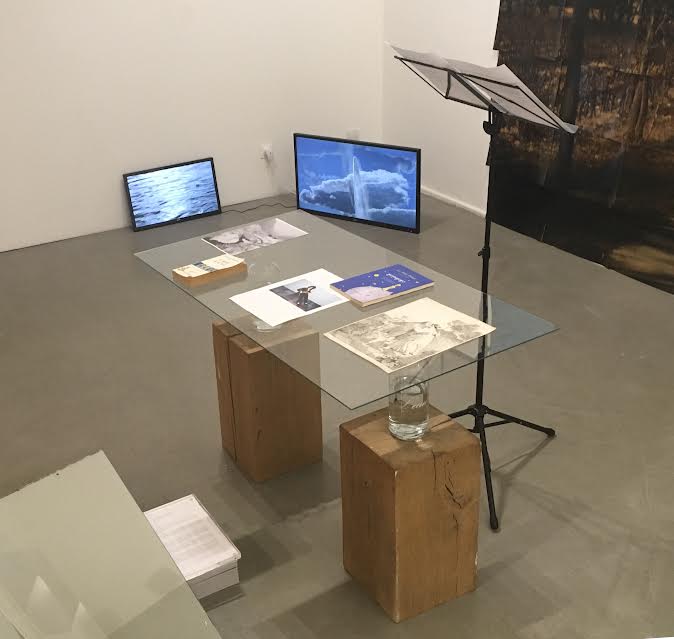 - devant la table, le pupitre avec le texte de la conférence énoncé par le personnage de Maître Fulgur, conférencier moite et guindé, dont la voix était portée ce jour là par Arsène Caens (le personnage de Fulgur est d’ailleurs directement issu d’un poème intitulé « Les doctes », publié l’année dernière sur le site des éditions Pou et traduit en anglais). On trouvait d’ailleurs aussi, sur le côté de la pièce, un coffret avec divers ouvrages publiés par les membres du collectif Pou : Alexandre Bédier, Cécile Riou, Patrick Autréaux, Guillaume Marie, Samuel Deshayes, entre autres.